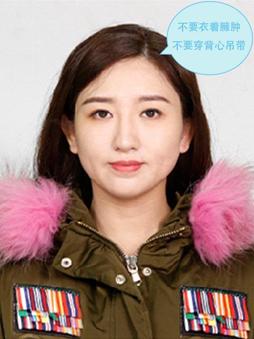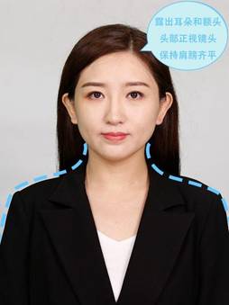 3、露出耳朵和額頭,頭部正視鏡頭,保持肩膀齊平,表情自然,嘴唇自然閉合。