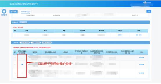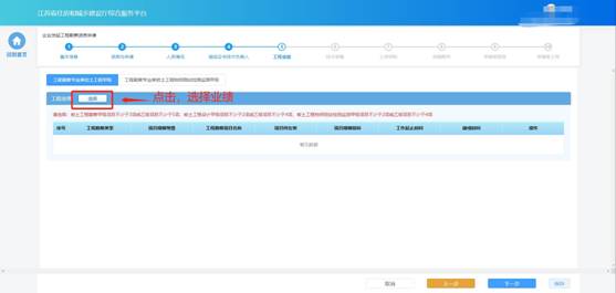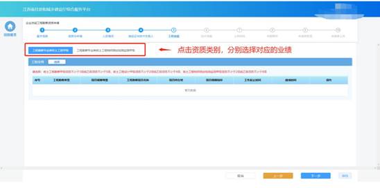 若申請的資質對于企業業績有要求,則申報流程會包含“工程業績”環節。在“工程業績”環節頁面,企業按照所申請資質類別分別選擇對應的業績。點擊“選擇工程業績”按鈕,選擇用于本次申報的業績。