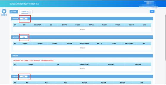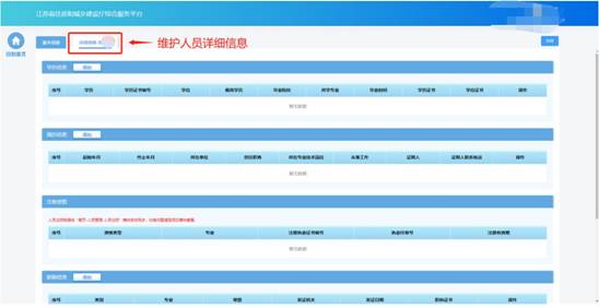 基本信息保存成功后,會出現詳細信息頁面,用于維護當前人員的詳細信息如學歷信息、職稱信息、簡歷信息、注冊資格、技術工人技能證書、個人業績信息等。