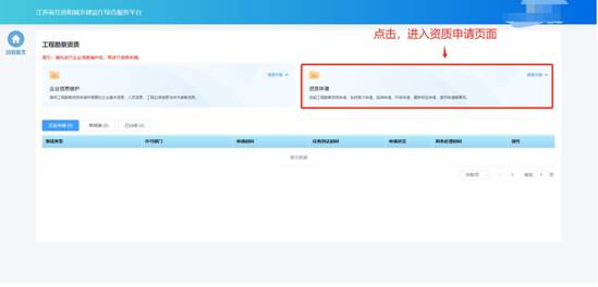 在進行企業信息維護后,點擊工程勘察資質功能模塊頁中“資質申請”進入資質申請頁面。