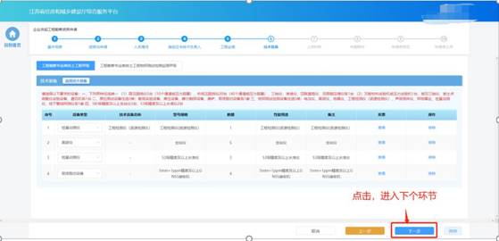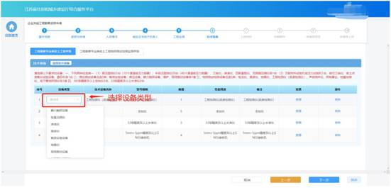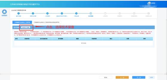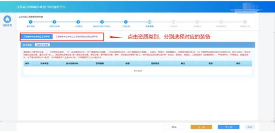 若申請的資質對于技術裝備有要求,則申報流程會包含“技術裝備”環節。在“技術裝備”環節頁面,企業按照所申請資質類別分別選擇對應的技術裝備。點擊“選擇技術裝備”按鈕,選擇用于本次申報的裝備。