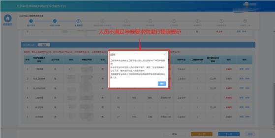 申請資質的資質標準對選擇的人員類型、數量進行初步校驗,對于不滿足要求的人員進行錯誤提示。若選擇人員滿足要求則進入下一個環節。