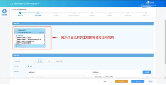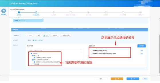 在“資質與申請”環節頁面,企業選擇申請事項以及申請資質。