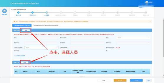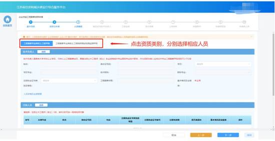 在“人員情況”環節頁面,企業按照所申請資質類別分別選擇對應的各類人員。選擇的人員信息為企業在“企業信息維護”頁面已經維護的對應角色的人員,如有信息不正確或者信息缺失,需返回“企業信息維護”頁面進行修改或補充后,再繼續進行申請。