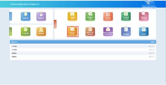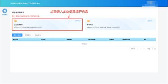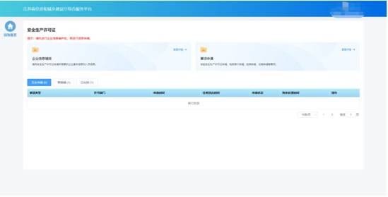 點擊首頁“企業管理”模塊中“安全生產許可證”圖標可進入安全生產許可證功能模塊頁進行相關業務維護和辦理。