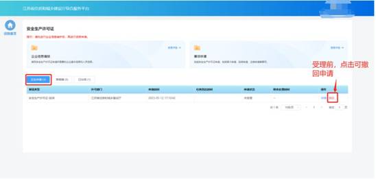 “正在申請”板塊中展示企業端已經提交的、目前處于審核流程中的事項申請。在管理端受理前,可點擊操作列中“撤回”按鈕撤回本次申請,撤回后的申請會進入“草稿箱”。
