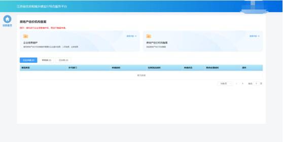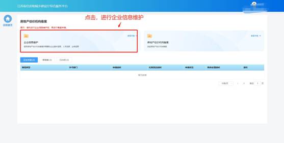 點擊首頁“企業管理”模塊中“房地產估價機構備案”圖標可進入房地產估價機構備案功能模塊頁進行相關業務維護和辦理。