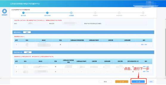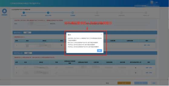 事項申請需要的人員選擇完成后,點擊“下一步”按鈕,系統會按照申報要求對選擇人員進行初步校驗,對于不滿足要求的人員進行錯誤提示。若選擇人員滿足要求則進入下一個環節。