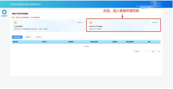在完成企業信息維護后,點擊房地產估價機構備案功能模塊頁中“房地產估價機構備案”進入備案申請頁面。