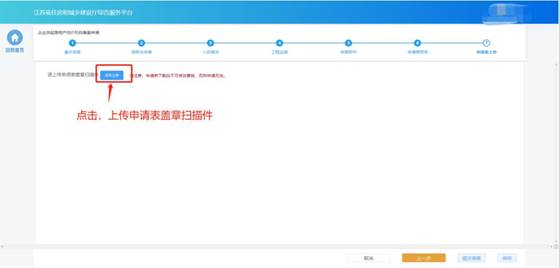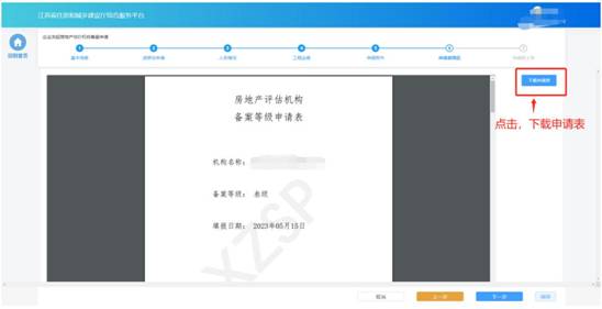 在“申請表預覽”頁面展示系統根據企業填報的內容自動生成的申請表,點擊“下載申請表”按鈕下載申請表Pdf文件,企業將申請表打印后進行蓋章,然后點擊“下一步”按鈕上傳蓋章掃描件。
