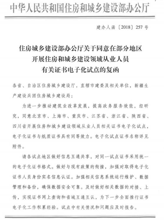 南通潤遠從省住建廳的公告得知,今后為提高服務和監管效能,實現證照數字化管理目標,根據《省政府關于加快江蘇政務服務網建設的實施意見》(蘇政發〔2017〕53號)《住房和城鄉建設部辦公廳關于同意在部分地區開展住房和城鄉建設領域從業人員有關證書電子化試點的復函》(建辦人函〔2018〕257號)(附件1)的文件精神,我省將啟用二級建造師(含臨時)、二級結構工程師、二級建筑師電子注冊證書(以下簡稱“電子證書”),這樣將會取消變更帖的寄放。現將有關事項公告如下: