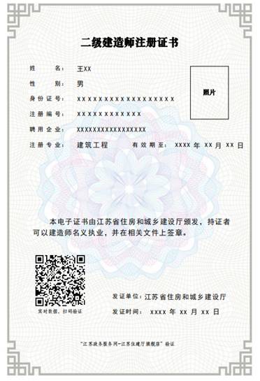 根據《中華人民共和國電子簽名法》規定,可靠的電子證書具備與同名紙質證書相同效力。各地住房城鄉建設行政主管部門在實名制、企業資質核準、工程招投標、施工許可、工程質量安全監督、執法監督檢查、竣工驗收及備案等管理中應當認可由江蘇省住房和城鄉建設廳核發的電子證書。