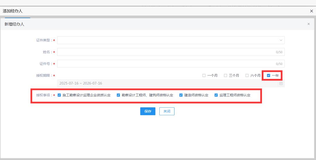 填寫經(jīng)辦人賬號信息(需要先注冊好經(jīng)辦人個人賬號),勾選授權(quán)項,選擇授權(quán)時間以后,點(diǎn)擊“保存”。