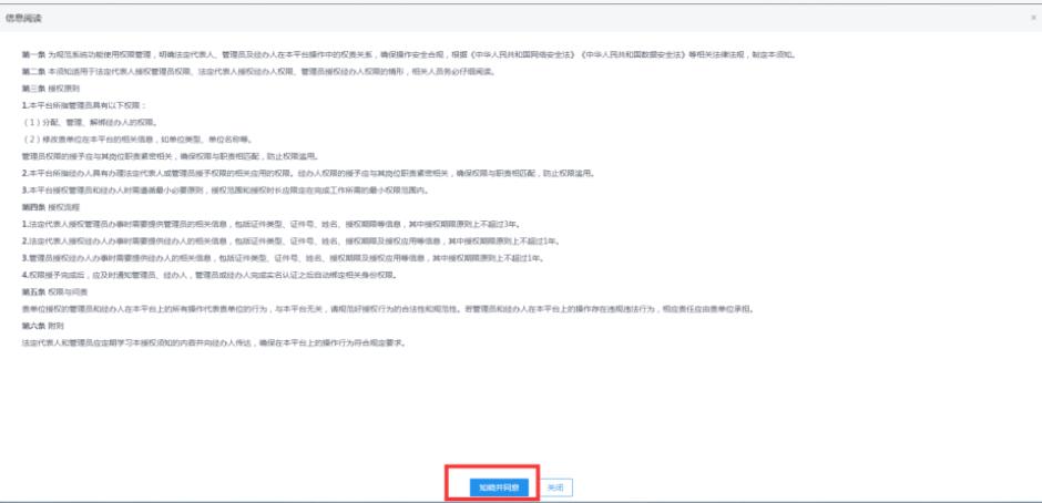 點(diǎn)擊“企業(yè)名稱”以后,再次點(diǎn)擊“確認(rèn)”,閱讀“平臺規(guī)則”,點(diǎn)擊“知曉并同意”以后,就可以完成經(jīng)辦人的授權(quán)。