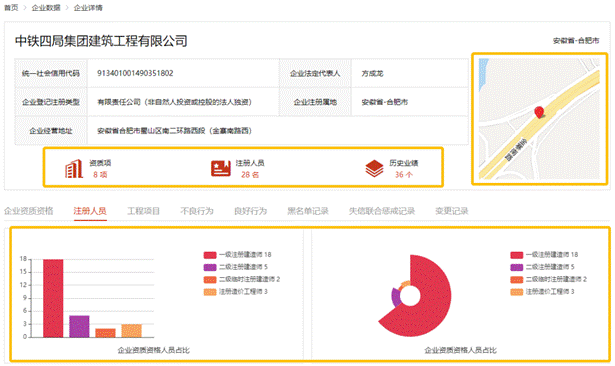另外在企業的注冊人員信息方面,新版網站采用了圖表等可視化方式展示。通過圖表看上去,一家企業有哪些注冊人員,哪類注冊人員占的比例更高,都有了體現,看著是挺美觀,不過好像沒什么實際作用。