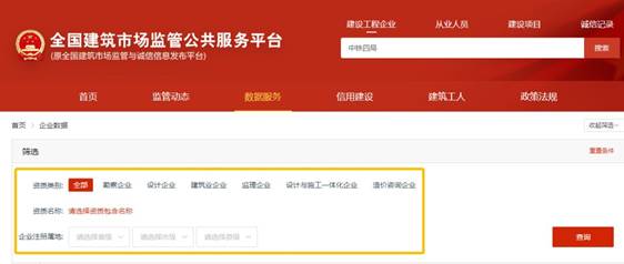 新版信息搜索框調整到了網站右上角,搜索項目合并精簡為人員、企業、項目、誠信信息4項。相對而言舊版的搜索查詢框更醒目一些。