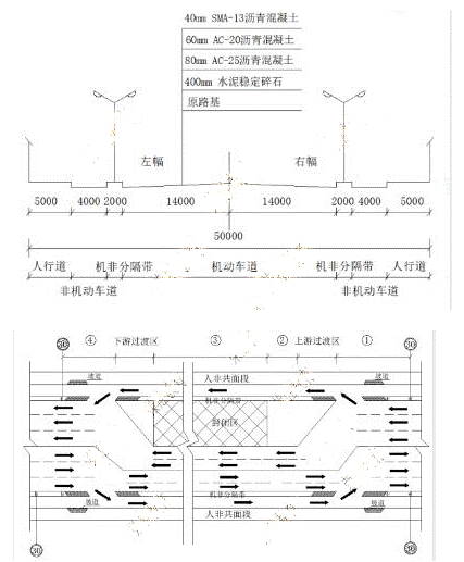 某單位承建城鎮(zhèn)主干道大修工程,道路全長2km,紅線寬50m,路幅分配情況如圖1-1所示,現(xiàn)狀路面結(jié)構(gòu)為40mmAC-13細(xì)粒式瀝青混凝土上面層,60mmAC-20中粒式瀝青混凝土中面層,80mmAC-25粗粒式瀝青混凝土下面層。工程主要內(nèi)容為:①對道路破損部位進(jìn)行翻挖補(bǔ)強(qiáng)。②銑刨40mm|舊瀝青混凝土上面層后,加鋪40mmSMA-13瀝青混凝土上面層。接到任務(wù)后,項目部對現(xiàn)狀道路進(jìn)行綜合調(diào)查,編制了施工組織設(shè)計和交通導(dǎo)行方案。并報監(jiān)理單位及交通管理部門審批,導(dǎo)行方案如圖1-2所示,因辦理占道、挖掘等相關(guān)手續(xù),實際開工如期比計劃日期滯后2個月。
