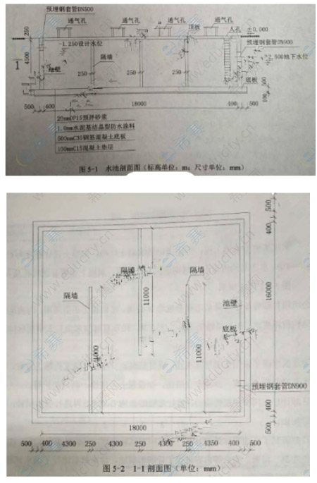 A公司承建某地下水池工程,為現(xiàn)澆鋼筋混凝土結(jié)構(gòu)。混凝土設(shè)計強(qiáng)度為C35,抗?jié)B等級為P8.水池結(jié)構(gòu)內(nèi)設(shè)有三道鋼筋混凝土隔墻,頂板,上設(shè)置有通氣孔及人孔,水池結(jié)構(gòu)如圖5-1、5-2所示。A公司項目部將場區(qū)內(nèi)降水工程分包給B公司。結(jié)構(gòu)施工正值雨期,為滿足施工開挖及結(jié)構(gòu)抗浮要求,B公司編制了降排水方案,經(jīng)項目部技術(shù)負(fù)責(zé)人審批后報送監(jiān)理單位。水池頂板混凝土采用支架整體現(xiàn)澆,項目部編制了頂板支架支拆施工方案,明確了拆除支架時混凝土強(qiáng)度、拆除安全措施,如設(shè)置上下爬梯、洞口防護(hù)等。項目部計劃在頂板模板拆除后,進(jìn)行底板防水施工,然后再進(jìn)行滿水試驗,被監(jiān)理工程師制止。項目部編制了水池滿水試驗方案,方案中對試驗流程、試驗前準(zhǔn)備工作、注水過程、水位觀測、質(zhì)量、安全等內(nèi)容進(jìn)行了詳細(xì)的描述,經(jīng)審批后進(jìn)行了滿水試驗。