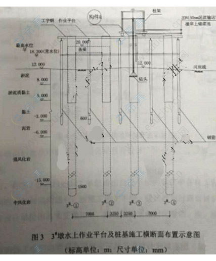 某公司承建一座跨河城市橋梁, 基礎(chǔ)均采用φ1500mm鋼筋混凝土鉆孔灌注樁,設(shè)計為端承樁,樁底嵌入中風(fēng)化巖層,2D (D為樁基直徑) ;樁頂采用蓋梁連接,蓋梁高度為1200mm,頂面標(biāo)高為20.000m。 河床地基揭示依次為淤泥、淤泥質(zhì)黏土、黏土、泥巖、強(qiáng)風(fēng)化巖、中風(fēng)化巖項目部編制的樁基施工方案明確如下內(nèi)容: (1)下部結(jié)構(gòu)施工采用水上作業(yè)平臺施工方案,水上作業(yè)平臺結(jié)構(gòu)為φ600mm鋼管樁+型鋼+人字鋼板搭設(shè),水上作業(yè)平臺如圖3所示(2) 根據(jù)樁基設(shè)計類型及橋位、水文、地質(zhì)筆情況設(shè)備選用“2000型”正循環(huán)回旋鉆孔施工(另配壓輪鉆頭等),成樁方式未定(3) 圖中A結(jié)構(gòu)名稱和使用的相關(guān)規(guī)定(4)由于設(shè)計對孔底沉渣厚度未做具體要求,灌注水下混凝土前,進(jìn)行二次清孔,當(dāng)孔底沉渣厚度滿足規(guī)范要求后,開始灌注水下混凝土。