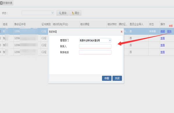 4、點擊“操作”中的“申報”,在彈出窗口中輸入聯系人及電話。