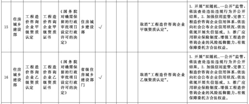 在全國范圍內直接取消部分工程資質審批,其中包括工程造價、施工三級等資質: