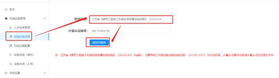 3.2檢測(cè)標(biāo)準(zhǔn)配置檢測(cè)流程開(kāi)始前,檢驗(yàn)檢測(cè)機(jī)構(gòu)在系統(tǒng)中選擇檢驗(yàn)標(biāo)準(zhǔn)。點(diǎn)擊下拉框選擇使用的標(biāo)準(zhǔn),填寫(xiě)檢測(cè)機(jī)構(gòu)的計(jì)量認(rèn)證編號(hào),點(diǎn)擊【保存并修改】完成配置。