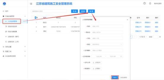 點(diǎn)擊【新增】按鈕,進(jìn)入新增頁(yè)面,填寫(xiě)檢驗(yàn)檢測(cè)人員信息,填寫(xiě)完成后點(diǎn)擊【保存】。