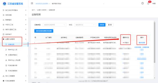 點(diǎn)擊菜單欄的起重機(jī)械管理—>設(shè)備檢測(cè),需整改的檢測(cè)機(jī)械設(shè)備顯示在列表中的第一條,最新?tīng)顟B(tài)欄顯示待整改狀態(tài)及操作欄出現(xiàn)【整改回復(fù)】按鈕,點(diǎn)擊查看【整改回復(fù)】按鈕可查看需整改的具體不合格項(xiàng)。