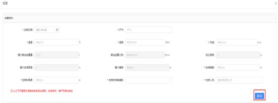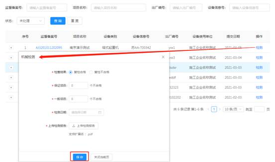 選擇需檢測(cè)的設(shè)備,點(diǎn)擊操作欄中的【檢測(cè)】,進(jìn)入檢測(cè)頁(yè)面。按要求填寫(xiě)檢測(cè)基本信息,“*”為必填項(xiàng),輸入完后點(diǎn)擊【保存】。