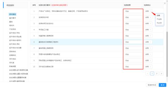 按項(xiàng)目類別逐一填寫(xiě),檢測(cè)結(jié)果為輸入框(輸入框?yàn)楸靥睿礄z測(cè)情況如實(shí)填寫(xiě);檢測(cè)結(jié)論為選擇框,選擇【合格】/【不合格】/【無(wú)此項(xiàng)】,點(diǎn)擊【保存】。