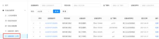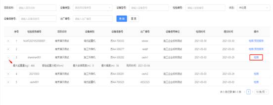 可根據(jù)項(xiàng)目名稱(輸入框)、設(shè)備類型(選擇框)、設(shè)備型號(hào)(輸入框)、檢驗(yàn)編號(hào)(輸入框)、狀態(tài)(選擇框)、設(shè)備信息號(hào)(輸入框)、出場(chǎng)編號(hào)(輸入框)其中一項(xiàng)或多項(xiàng)對(duì)施工企業(yè)項(xiàng)目部申請(qǐng)檢驗(yàn)檢測(cè)的機(jī)械設(shè)備進(jìn)行模糊查詢。點(diǎn)擊【重置】清空當(dāng)前選擇及輸入的內(nèi)容。
