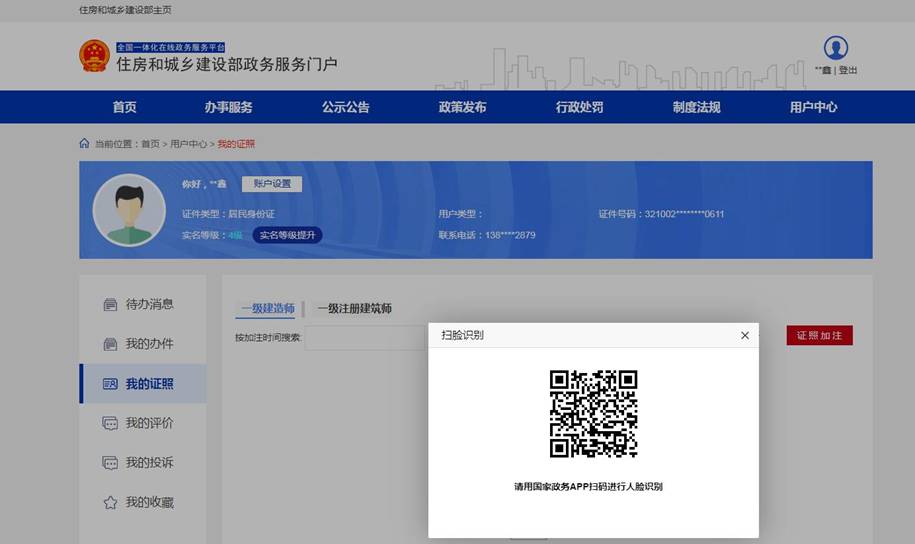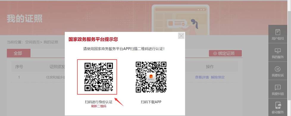點擊[我的證照],通過“國家政務服務平臺”手機APP掃描頁面上的二維碼,人臉識別認證通過后進入電子證照管理功能。