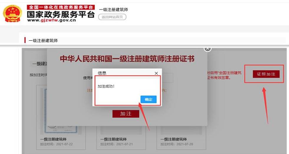 選擇“一級注冊建造師”,點擊[證照加注],即可加注成功。首次使用或之前加注日期已過期,點擊頁面右上角[證照加注],在彈窗頁面繼續點擊[加注],提示“加注成功!”表示電子證書加注完成,加注有效期為180天。