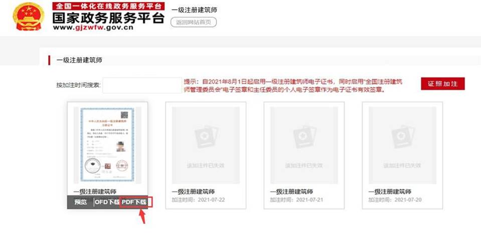 (二)一級注冊建造師可登錄“住房和城鄉建設部政務服務門戶”或“國家政務服務平臺”(以下簡稱“政務平臺”)進入“我的證照”,查看和下載本人一級注冊建造師電子注冊證書(以下簡稱“電子證書”)。電子證書使用時限為180天,注冊有效期不足180天的,使用時限截止日期以注冊有效期截止日期為準。超出使用時限的電子證書無效,需重新下載電子證書并再次確認使用時限。