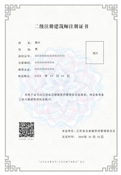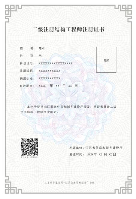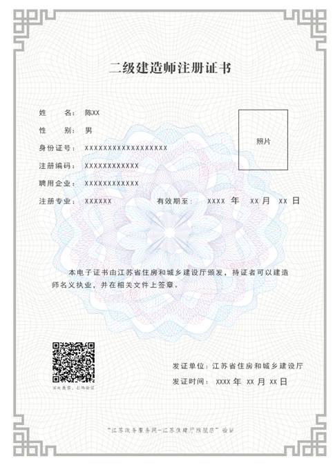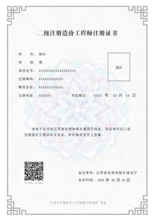 準予注冊的,由江蘇省住建廳核發(fā)《二級建造師注冊證書》《二級注冊造價工程師注冊證書》《二級注冊建筑師注冊證書》《二級注冊結構工程師注冊證書》,注冊證書以電子證照形式發(fā)放(證書樣式詳見附件2)。