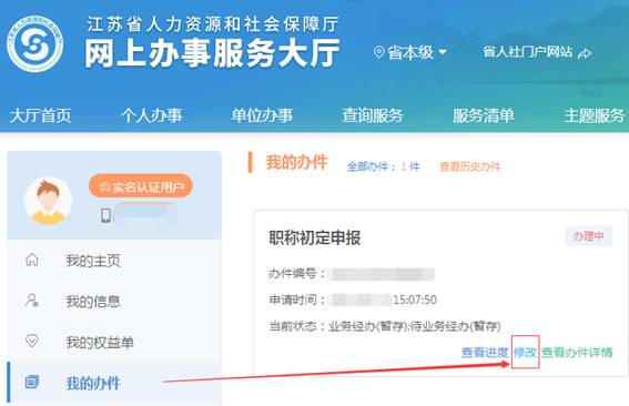 請點擊“我的辦件” → 職稱初定申報 → 修改,繼續填報。