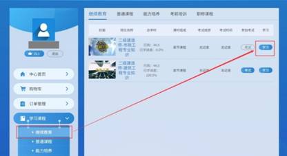 在左側(cè)菜單欄選擇“學(xué)習(xí)課程”,點擊“繼續(xù)教育”頁簽查看本賬號的繼續(xù)教育課程。用戶可在繼續(xù)教育課程列表右側(cè),點擊“學(xué)習(xí)”按鈕進(jìn)入視頻播放頁面。